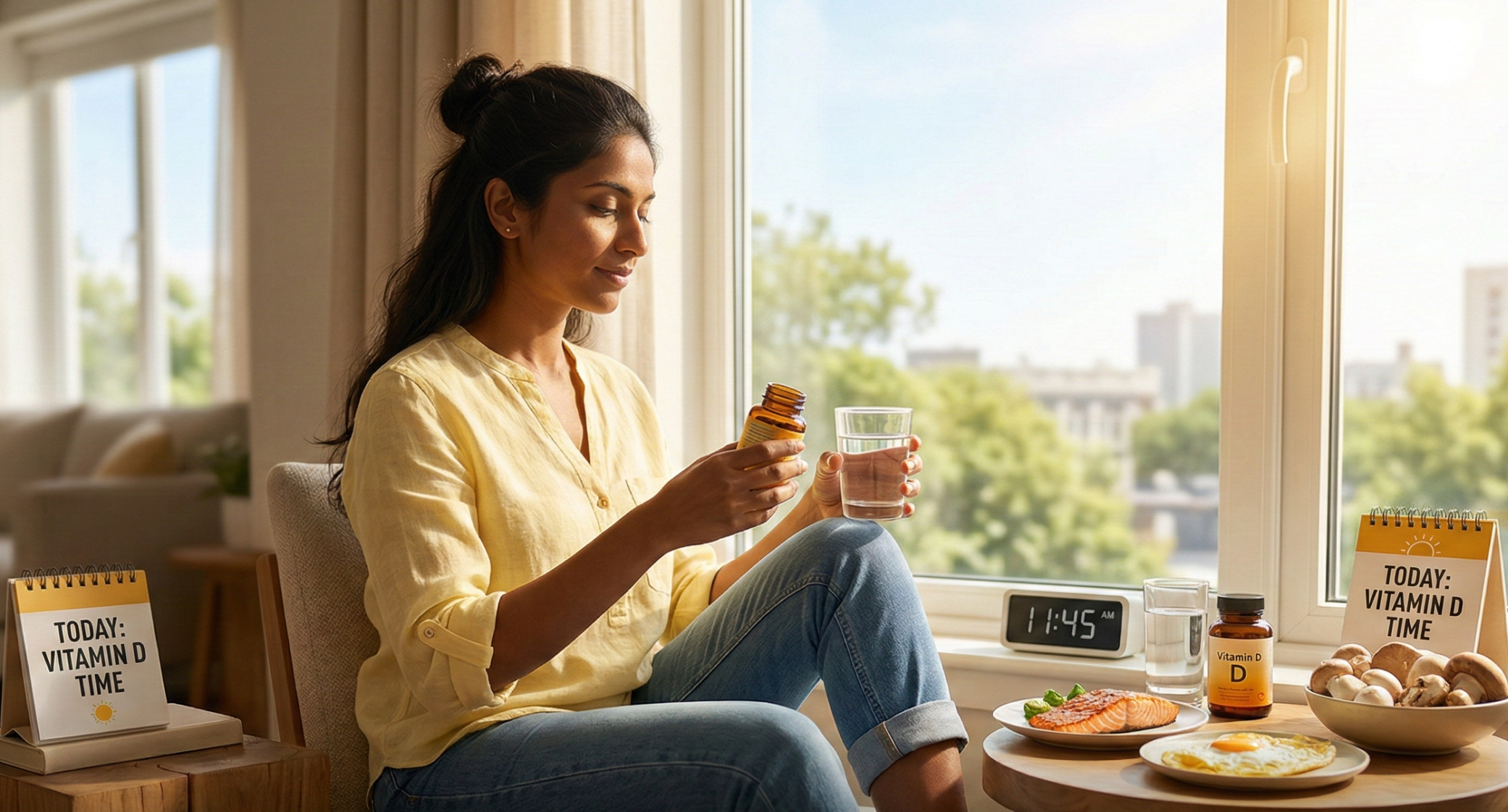 अगर आपकी जीवनशैली ऐसी है कि आप धूप नहीं ले पाते और डॉक्टर ने आपको विटामिन डी सप्लीमेंट (गोली या कैप्सूल) की सलाह दी है, तो इसे लेने का भी एक विज्ञान है, भोजन के साथ लें विटामिन डी एक Fat-soluble (वसा में घुलनशील) विटामिन है। इसका मतलब है कि इसे शरीर में सोखने के लिए ‘फैट’ की ज़रूरत होती है। इसे दिन के सबसे भारी भोजन (लंच या डिनर) के साथ लेना सबसे अच्छा है। अगर आप इसे खाली पेट लेते हैं, तो यह पूरी तरह शरीर में एब्जॉर्ब नहीं हो पाएगा। कुछ अध्ययनों के अनुसार, रात में विटामिन डी लेने से नींद का हार्मोन ‘मेलाटोनिन’ प्रभावित हो सकता है, जिससे नींद आने में दिक्कत हो सकती है। इसलिए इसे सुबह या दोपहर के भोजन के साथ लेना ही सबसे सही है।